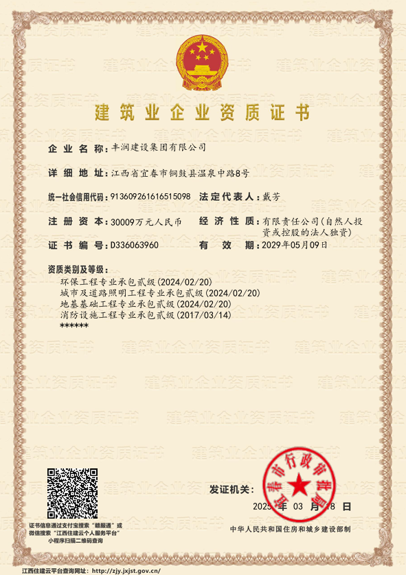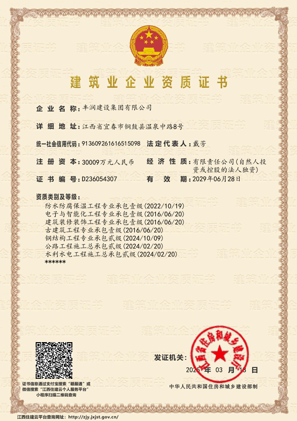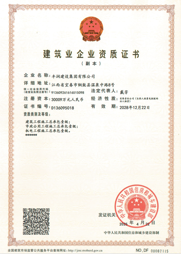 豐潤建設(shè)集團(tuán)有限公司的前身是橫峰縣第二建筑公司,成立于1958年8月,于2008年4月國企改制后更名為:豐潤建設(shè)集團(tuán)有限公司,公司現(xiàn)注冊地:銅鼓縣溫泉鎮(zhèn)。該集團(tuán)是具有六十六年歷史的房屋建筑施工總承包企業(yè)。在公司全體員工的共同努力下,已漸發(fā)展成為較大規(guī)模的建筑施工企業(yè)。公司注冊資金 30009 萬元,公司現(xiàn)有職工698人,其中擁有專業(yè)技術(shù)職稱的人員372人,含一級建造師88人、二級建造師61人、高級職稱15人、中級職稱近70人、助理工程師200余人、園林項(xiàng)目經(jīng)理(二級)20余人。現(xiàn)擁有14項(xiàng)資質(zhì),其中一級承包資質(zhì)7項(xiàng),業(yè)務(wù)范圍涵蓋:建筑工程施工總承包、機(jī)電工程施工總承包、市政公用工程施工總承包、建筑裝修裝飾工程專業(yè)承包、防水防腐保溫工程、電子與智能化工程、古建筑工程及其他二級資質(zhì)等。擁有相應(yīng)配套工程機(jī)械設(shè)備和檢測器材。豐潤建設(shè)集團(tuán)有限公司近年分別在黑龍江、天津、北京、浙江、福建、新疆、云南、四川、青海、海南、湖北、安徽、廣東中山、內(nèi)蒙古、九江、宜春、贛州、上饒、鷹潭等省市增設(shè)分支機(jī)構(gòu),形成了立足江西、輻射全國的運(yùn)營格局。