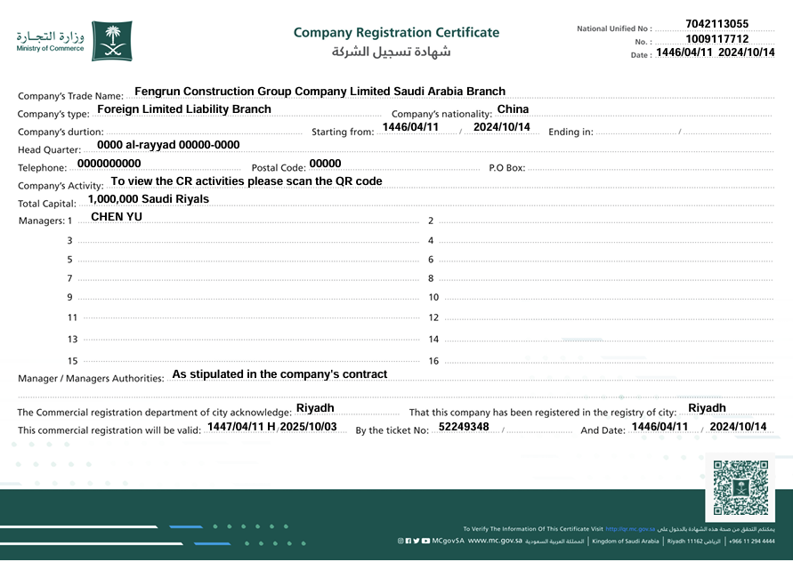 公司在國內(nèi)市場已取得一定成績,但為實現(xiàn)可持續(xù)發(fā)展,拓展海外市場成為必然選擇。作為領(lǐng)先的建筑企業(yè),豐潤建設(shè)集團于2024年10月在沙特阿拉伯設(shè)立分公司,將世界級的建筑設(shè)計、工程技術(shù)與可持續(xù)發(fā)展理念帶入中東市場,為沙特的基建升級與城市發(fā)展注入新動力。沙特“2030愿景”正推動經(jīng)濟多元化與城市化進程,豐潤建設(shè)集團將積極參與大型基建項目、綠色建筑、地標(biāo)工程等。深耕沙特,共建未來!